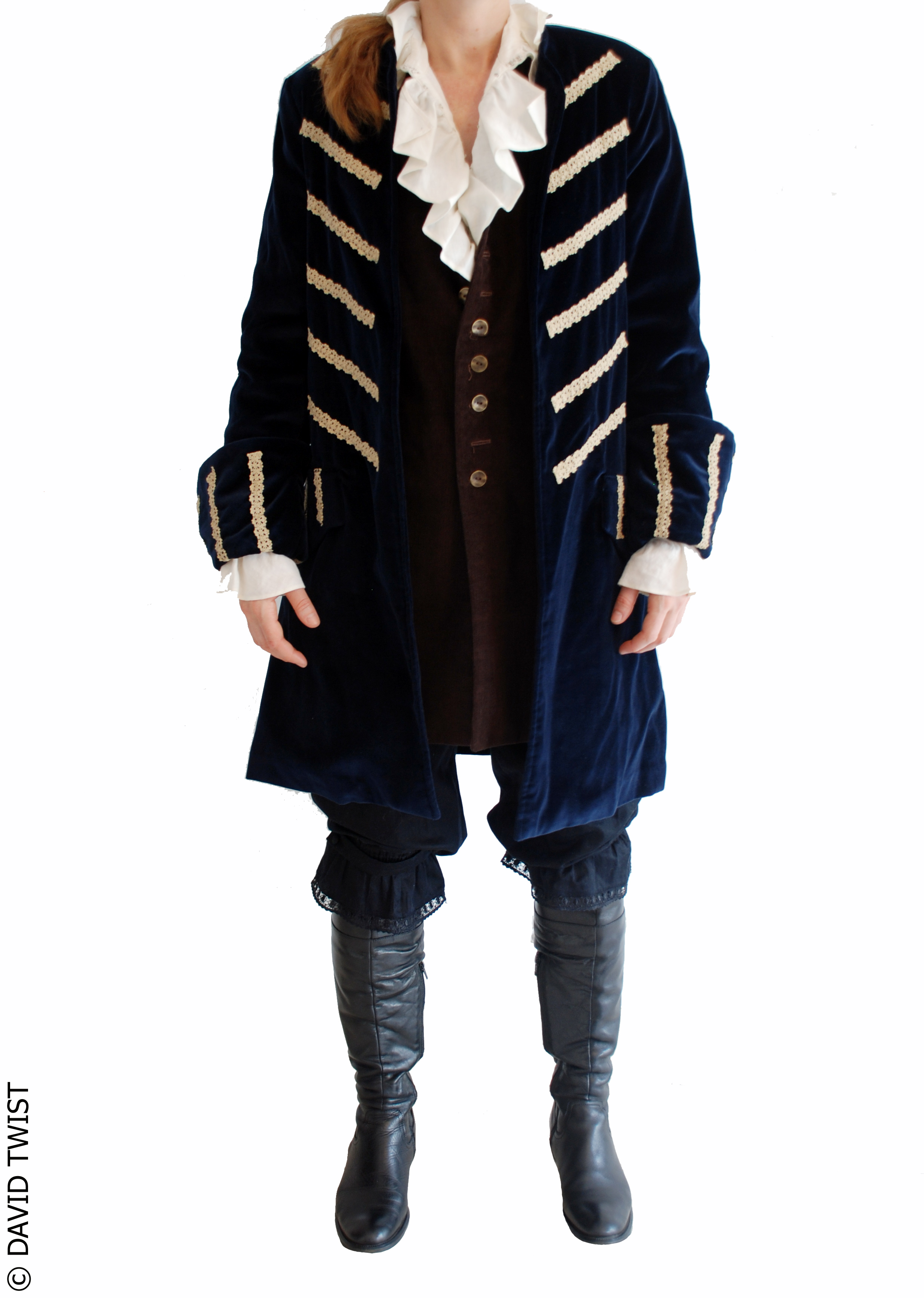 Il porte également une sous-veste fermée par des boutons en laiton sur une chemise à jabot de lin, un pantacourt à volant et de grandes bottes de cuir.